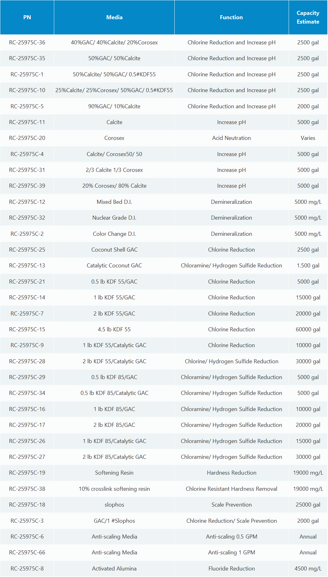 | RC-25975C-10 | 25%Calcite/ 25%Corosex/ 50%GAC/ 0.5#KDF55 | Chlorine Reduction and Increase pH | 2500 gal |
