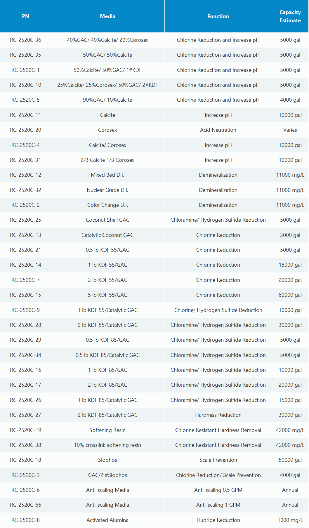 | RC-2520C-10 | 25%Calcite/ 25%Corosex/ 50%GAC/ 2#KDF | Chlorine Reduction and Increase pH | 5000 gal |