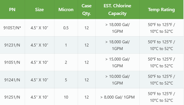 | PN | Size | Micron | Case Qty. | EST. Chlorine Capacity | Temp Rating |